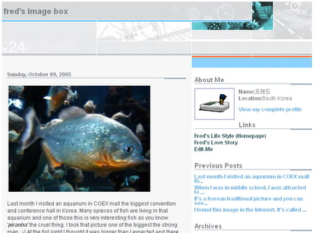 간단하게 영어공부 삼아 작문공부 삼아 올리는 사이트이다. 물론 어색한 구문도 많지만 혼자서 영어를 사용 한다는 의미도 있고 개인적인 이미지 파일들을 올리는 재미도 있다.