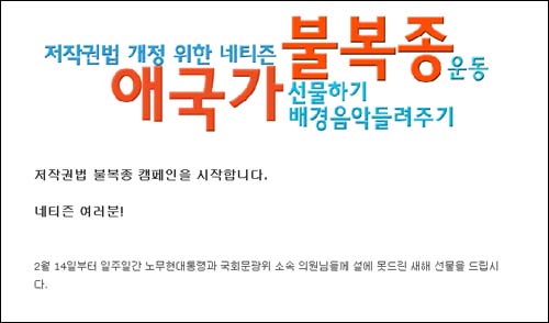 1. 지난 1월 결성된 에서는 오늘 (2월 14일) 네티즌들의 의견을 모아 저작권법에 대한 공동성명서를 발표함과 동시에 저작권법 불복종운동으로서 14일부터 일주간 노무현 대통령과 국회 문화관광위원회 소속 의원들에게 애국가 선물하기 캠페인, 홈페이지와 블로그에서 애국가 배경음악 들려주기 캠페인 등 저작권법 불복종 운동을 시작합니다(http://www.ipleft.or.kr/antilaw/campaign).