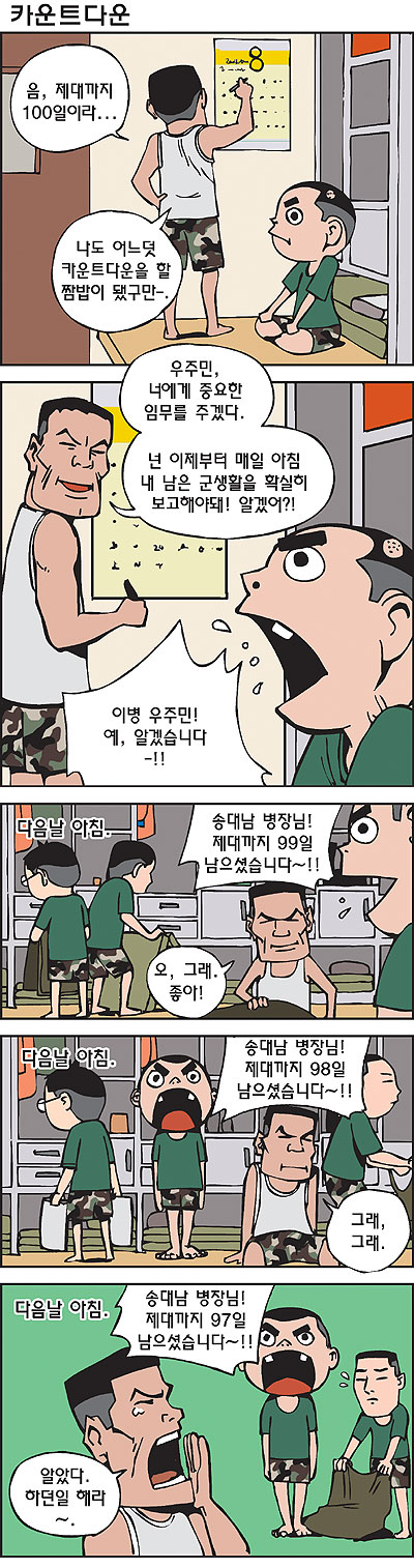 우리 부대에서도 장난으로 최고 막내에게 일부러 자신이 몇일 남았는지 매일 보고하라고 했다. 이 만화에서 보면 이병이 자기 밑에 이등병에게 그걸 시켰다는 것을 알 수 있는데…