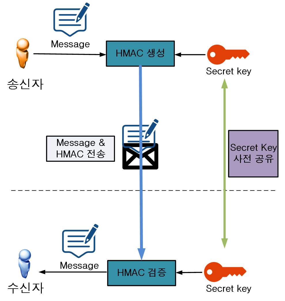 - 공유키를 이용하여 전달할 메시지의 해시값을 양쪽에서 생성하여, 메시지의 위변조 여부를 판단