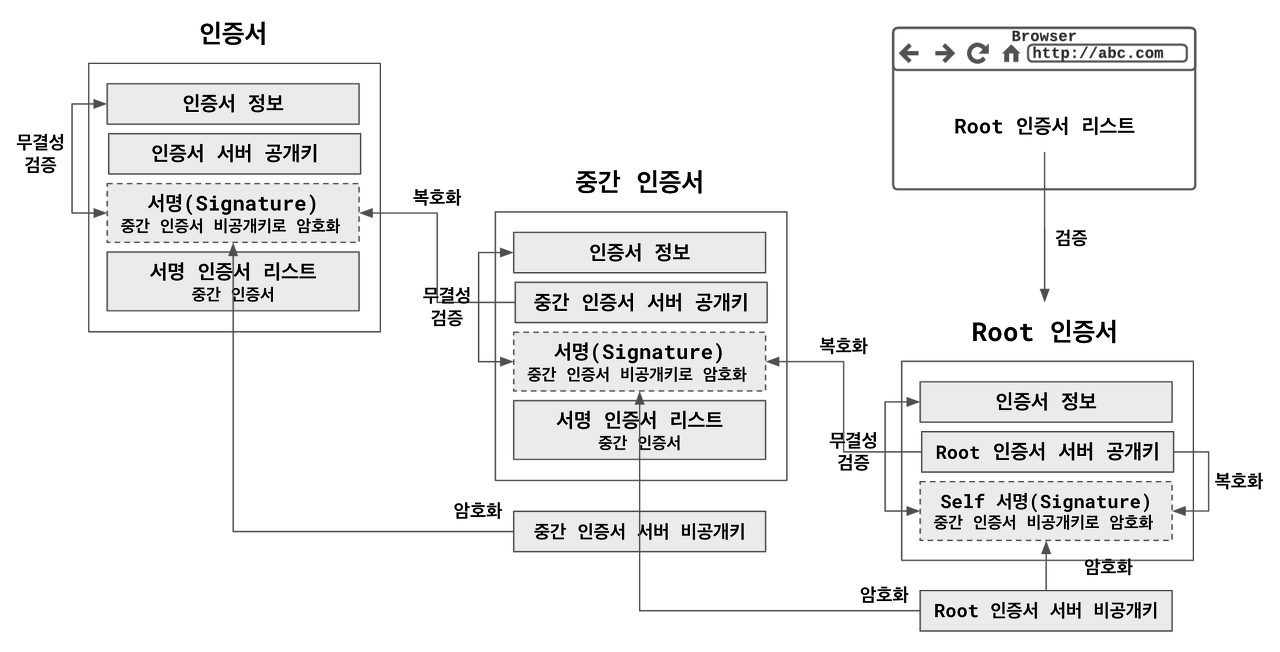 - 인증서 체인: 인증서를 신뢰할 수 있도록 서명으로 만들어진 체인